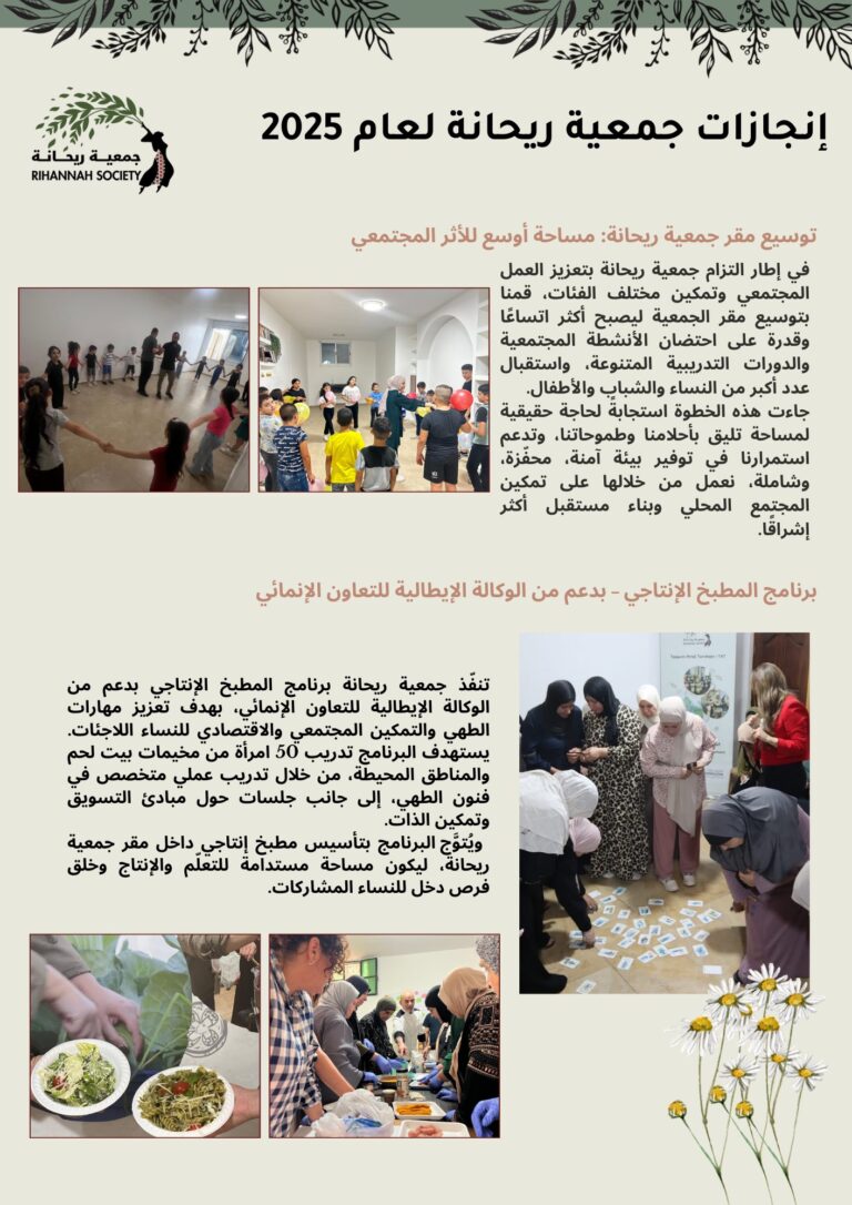 أسرة جمعية ريحانة، بهيئتها الإدارية وكادرها ومتطوعيها، تتمنى لشعبنا الفلسطيني عامًا نرجوه عامًا بالخير والأمن، يحمل في طياته أيامًا أكثر عدالة نعيشها بكرامة. وكل عام ونحن أقرب إلى الحرية، وأكثر ثباتًا على الحق.